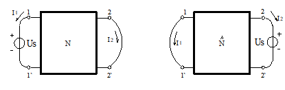 1)第一種形式。在只含一個(gè)獨(dú)立電壓源的線性電路N中,如果線性電路N的1-1’端接電壓源,見圖1(a)、2-2’端短路時(shí),產(chǎn)生的響應(yīng)為i2。當(dāng)把電壓源US移到2-2’端,如圖1(b),1-1’端短路時(shí)產(chǎn)生的響應(yīng)為i1,則互易定理說明i1等于i2。形象地說,就是電壓源與電流表互換位置,電流表的讀數(shù)不變。